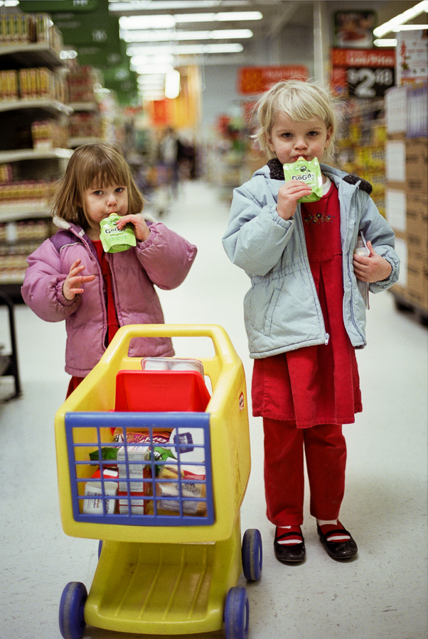But instead, I’m going to share some pictures of our recent grocery trip, when I let the girls bring along their toy shopping cart to “help me”. We got lots of smiles from store employees and fellow shoppers; we also got a few stink-eyes from people who were almost run over by my little energetic cart-pushers.